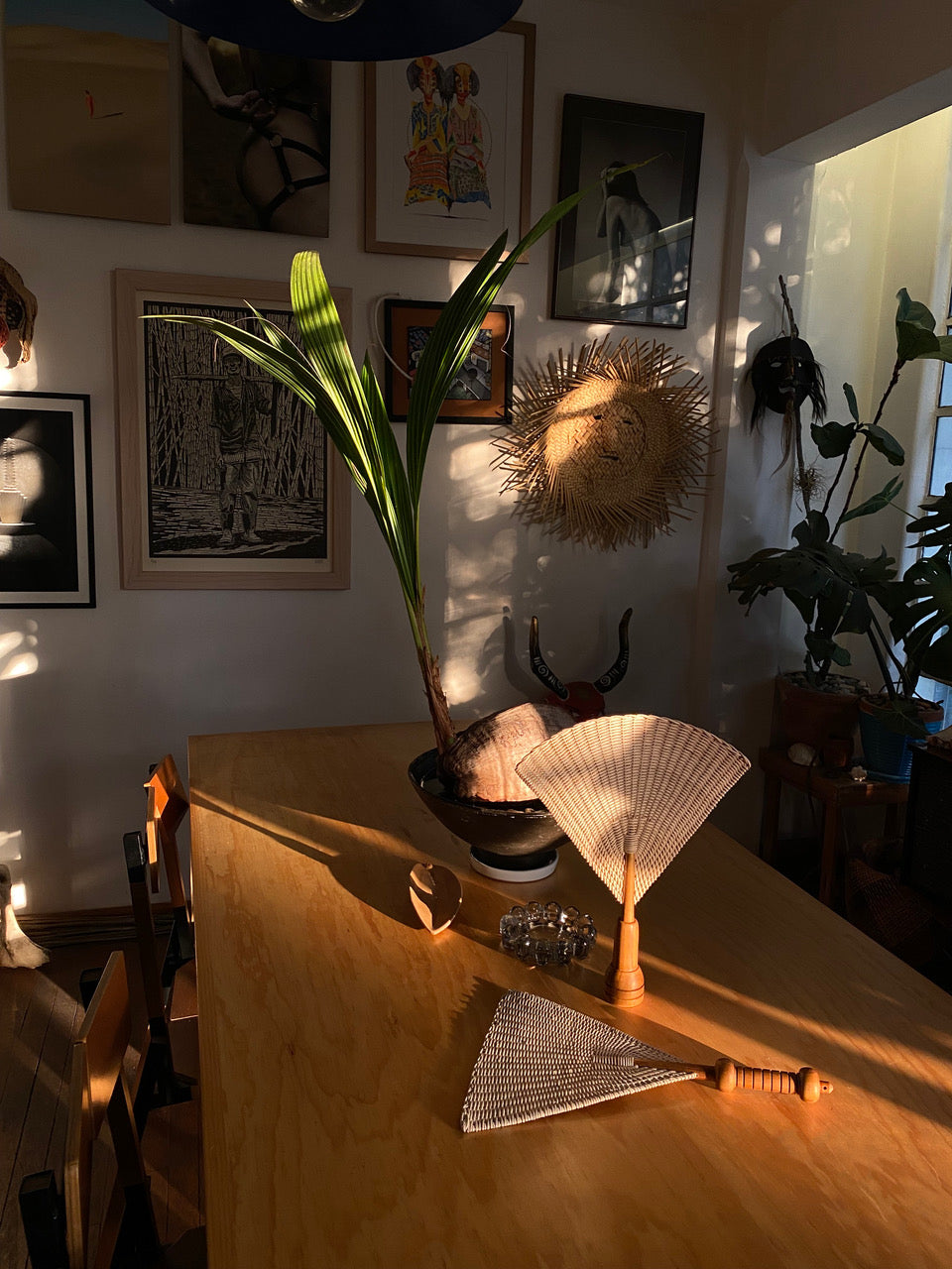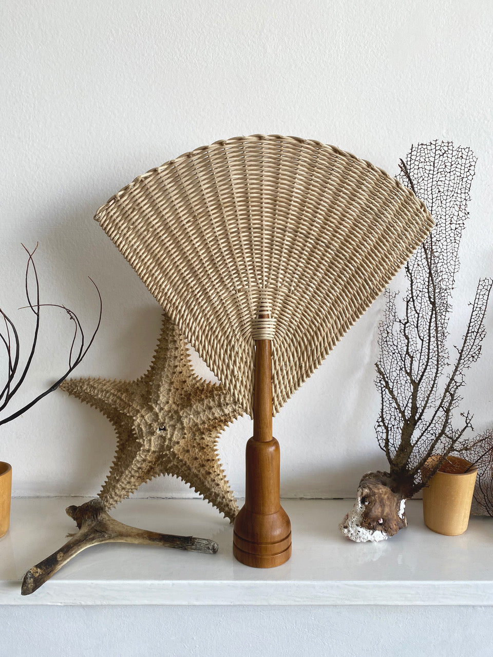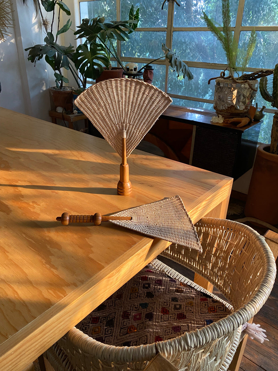 Abanico hecho a mano, manufacturado en parte en el Estado de Campeche y en el Estado de Querétaro.Esta pieza está hecha de madera de teca y de fibra de mimbre. El Abanico Tequis puede permanecer parado por sí mismo.