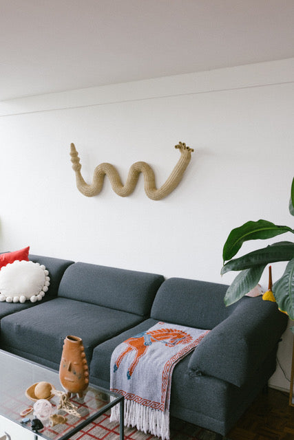 Rattlesnake-shaped pieces inspired by a sculpture of Ahuítzotl, an aquatic animal from pre-Hispanic mythology that features a human hand at the end of its tail. These pieces are woven without an internal metal structure using a fiber called G'noo Xombé Nisin, in Mazatec, the local language of the region.