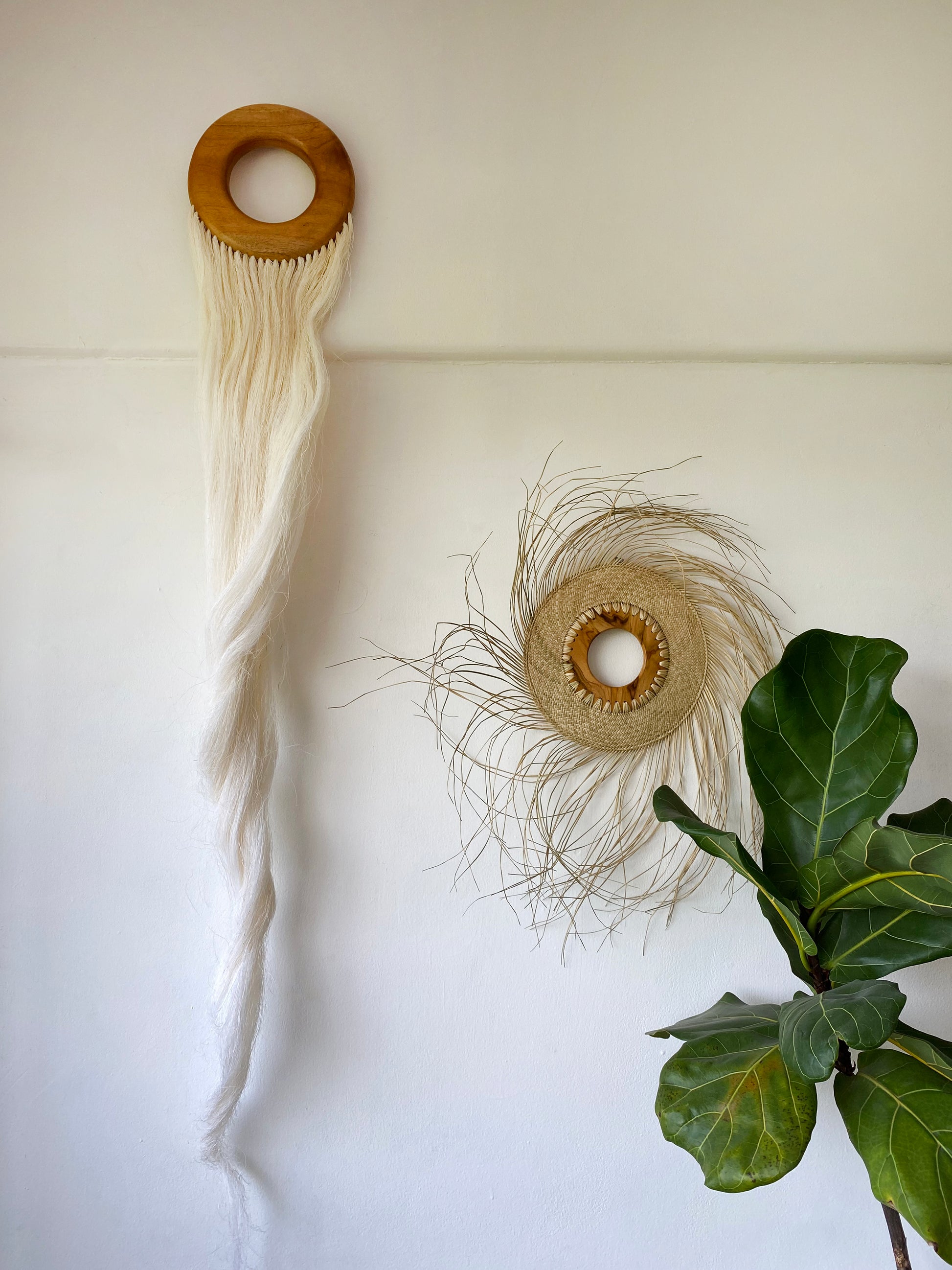Esta pieza decorativa de pared fue hecha a mano por dos increíbles artesanos. Primeramente, Felipe de Campeche, talla la madera a mano para crear esta particular forma; una vez terminada la pieza de madera, Rubén de Hidalgo, agrega la fibra de Ixtle usando una técnica para hacer cepillos a mano. La fibra del Ixtle proviene de un tipo específico de Maguey -Agave Lechugilla- y se ha usado en México desde tiempos prehispánicos. Cada pieza de madera es única.Pieza de madera:20cmColgante de fibra: ca 140cm
