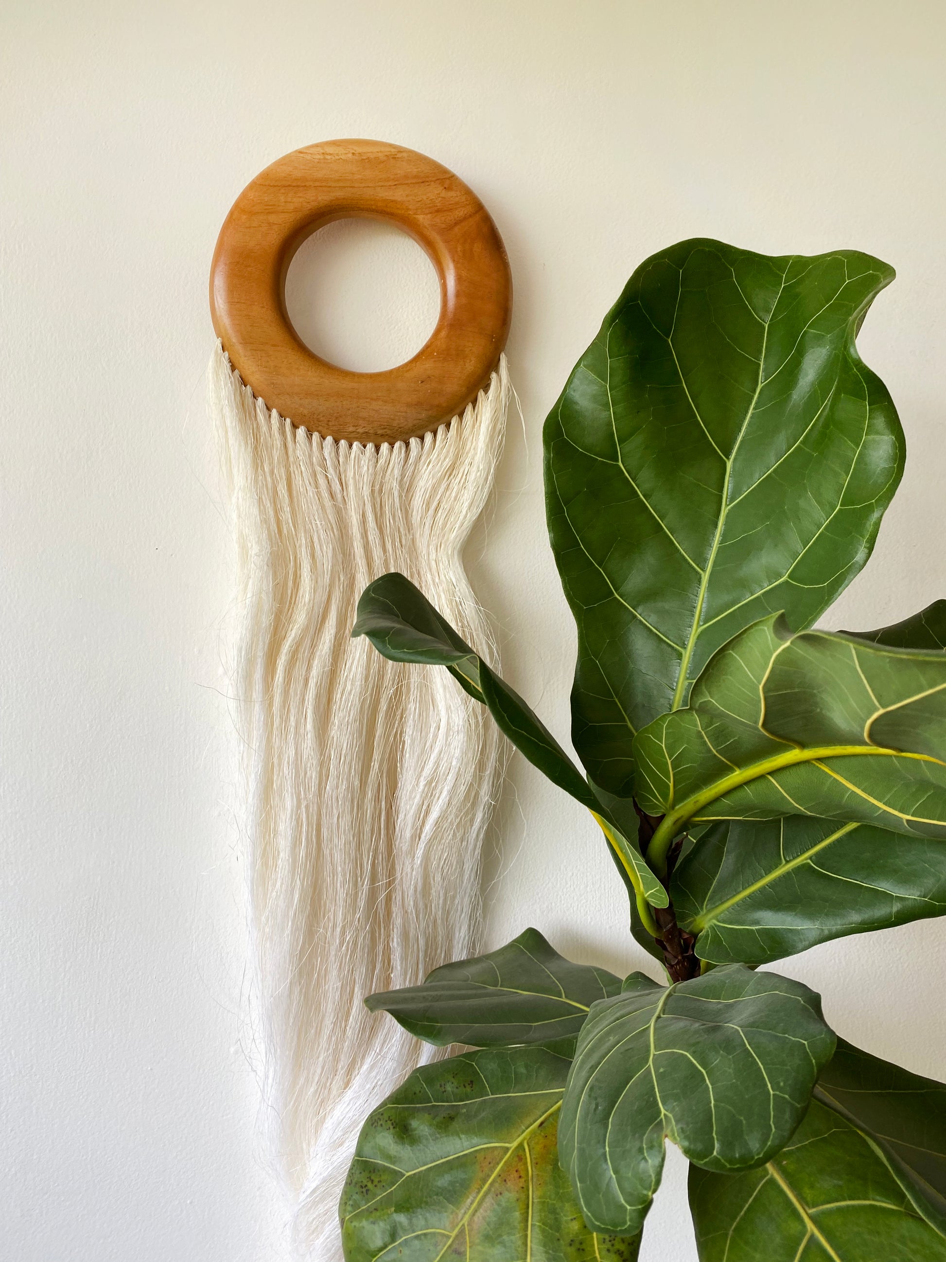 This decorative wall hanger was hand-made by two great artisans. Firstly, Felipe from Campeche, hand-carves the wood to this unique shape; secondly, Rubén from Hidalgo, attaches the Ixtle fiber using a hand-made brush technique.