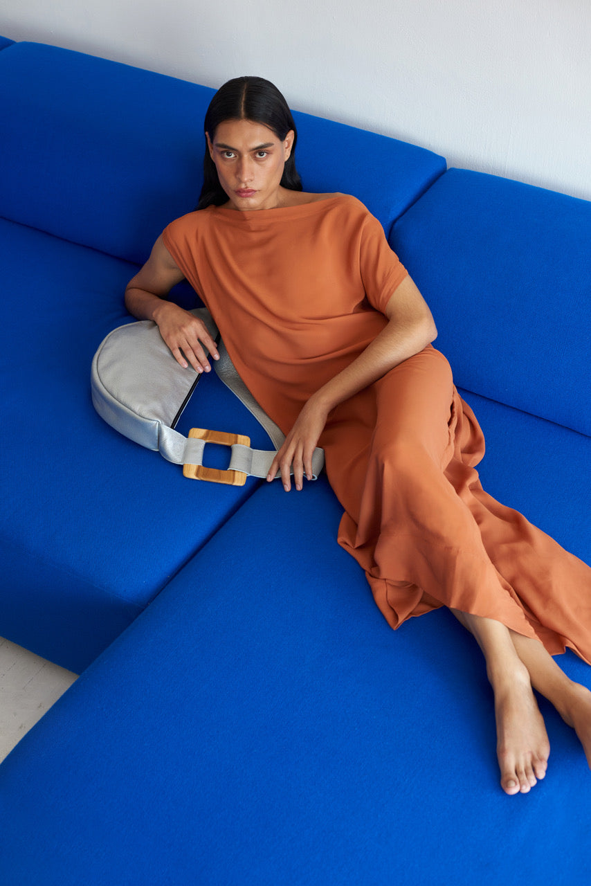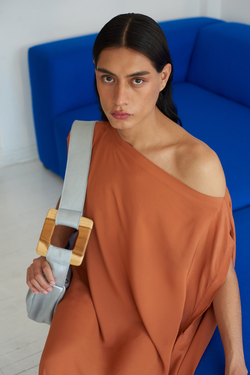 Large size bag made using silver-color tumbled leather. This piece was hand-made in León, Guanajuato and it features an internal pocket and a hand-carved teak wood detail made in Escárcega, Campeche.