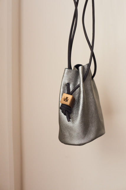 This silver leather mini bucket bag features a black leather cord and a wood detail in the front. The latter is hand carved by Felipe, our wood artisan, in the town of Escárcega, Campeche. This piece also features a small interior pouch for smaller items.