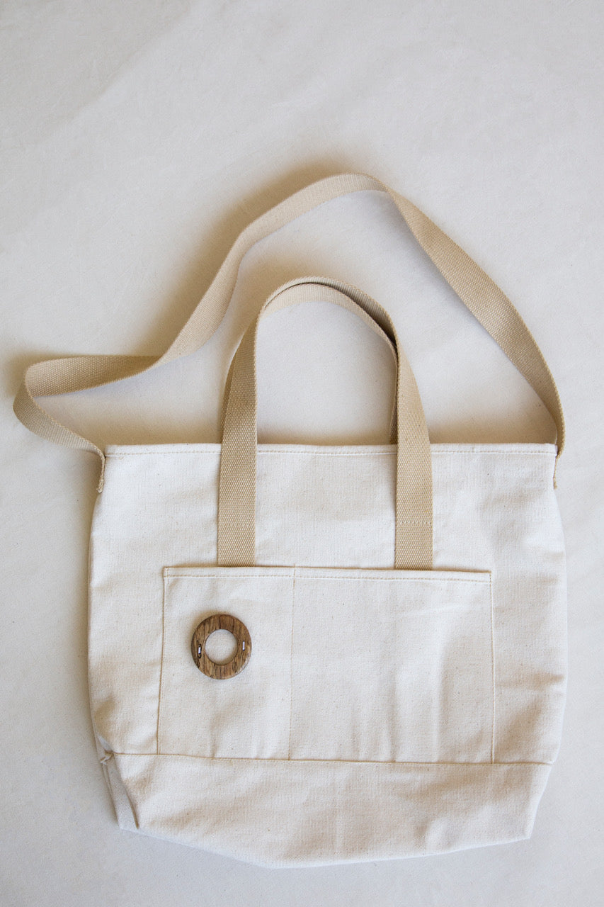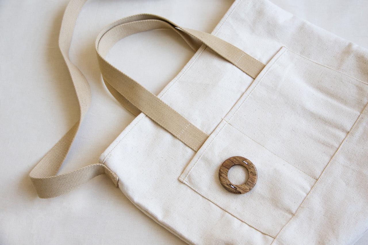 Esta gran tote es hecha de loneta gruesa 100% algodón y cuenta con dos bolsas exteriores, además de dos detalles en madera, labrados a mano en Campeche, México.